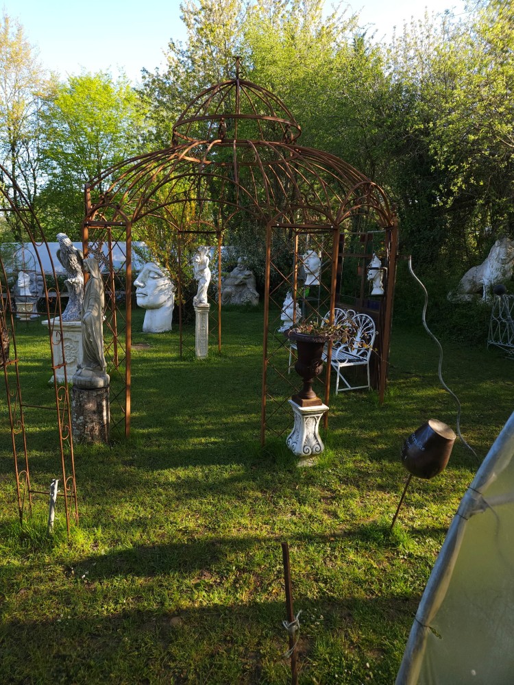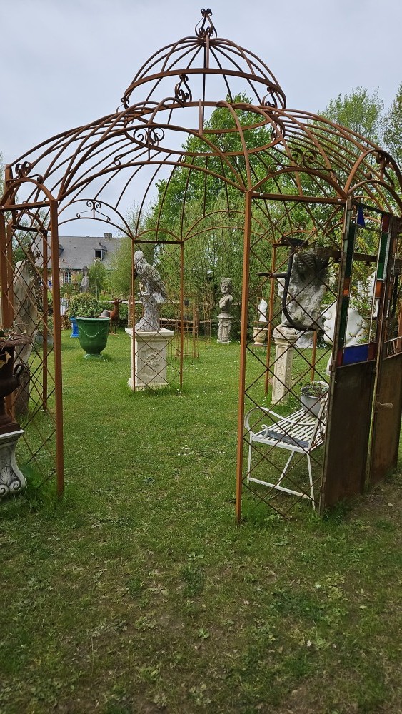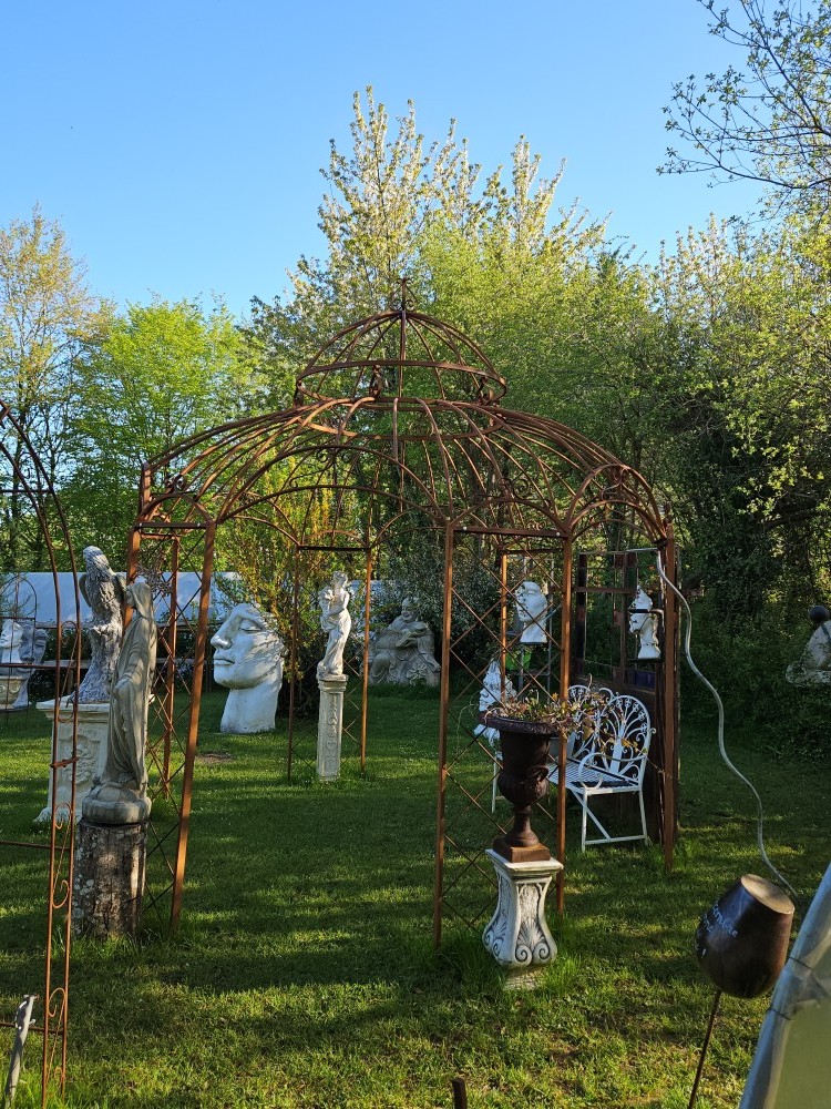 Embellissez votre jardin avec cette splendide gloriette en métal au style romantique et vieilli. Sa structure en fer forgé patiné par le temps lui confère un charme fou et une allure de château, créant un point focal enchanteur dans votre espace extérieur. Idéale pour accueillir vos plantes grimpantes, comme abri pour une table de jardin, ou simplement comme élément décoratif majestueux.