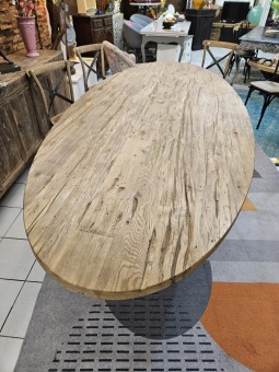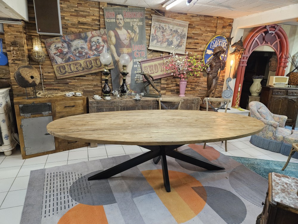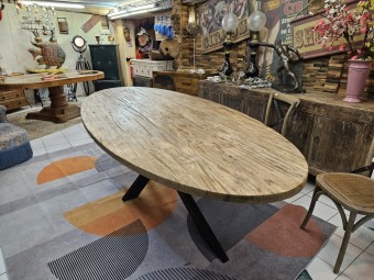 - Table ovale en chêne avec piètement métallique.
